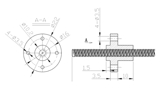 This brass alloy traveling nut is useful for mounting Tr8x8 leadscrews (8 mm-diameter rods with four independent trapezoidal threads spaced 2 mm apart). One full revolution of the leadscrew results in an 8.0 mm linear displacement of the traveling nut.